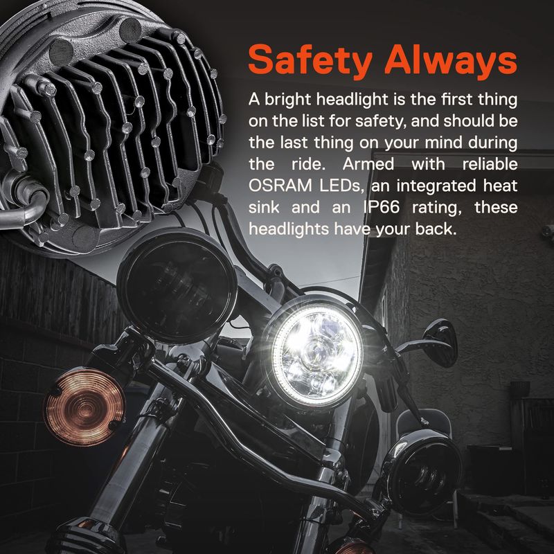 Diseñado para superar: tu Harley está diseñada para soportar cualquier cosa que la carretera le arroje. Nuestras luces están construidas de la misma manera con clasificación de impermeabilidad IP66, lentes inastillables y cuerpo de aluminio fundido duradero para que coincida con la resistencia de tu bicicleta. El exceso de calor es el némesis de los LED. La carcasa de aluminio de nuestro faro está equipada con cuchillas verticales capaces de disipar el exceso de calor, lo que permite que la luz se queme brillante en los próximos años.