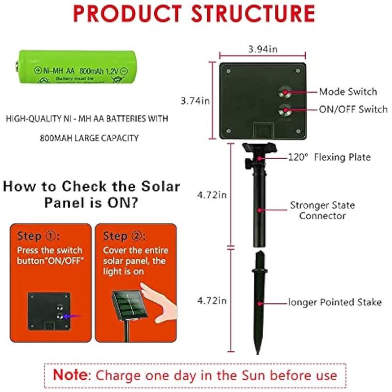 Fuente de alimentación solar: Funciona con energía solar, sin necesidad de reemplazar las baterías, encendido automático por la noche y apagado automático durante el día, ahorrando energía y protegiendo el medio ambiente. Deje que la vida se vuelva más eficiente y más conveniente. Cada panel solar está equipado con una batería Ni-MH AA de 2,624.7 ft AH, puede funcionar de 10 a 14 horas cuando está completamente cargado.