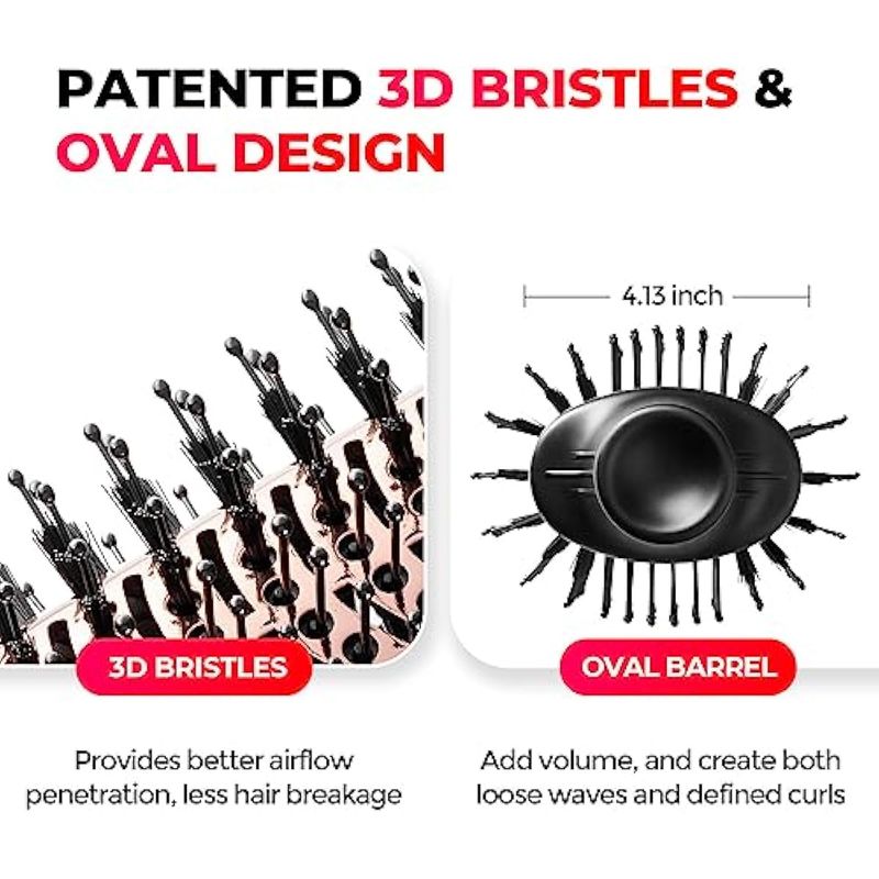 Diseño de cerdas patentadas para resultados de salón: las cerdas patentadas de tacto suave permiten un contacto cercano en la raíz. ? Las cerdas cortas con mechones pueden añadir elevación adicional en la raíz y ayudar a desenredar cada nudo de tu cabello. Cientos de cerdas se deslizan sin esfuerzo a través de la longitud de tu cabello, añadiendo un cuerpo de longitud completa con plenitud y rebote. ? Las cerdas de nailon proporcionan protección antiquemaduras mientras masajea el cuero cabelludo para una experiencia más cómoda.