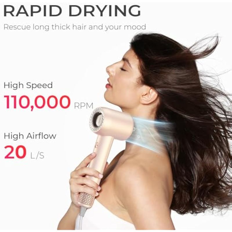 Secado rápido con iluminación: ya sea tu prisa matutina o una actualización después del entrenamiento, el secador de pelo TYMO transforma el cabello húmedo en minutos. Gracias al potente motor sin escobillas de 110,000 RPM y al flujo de aire de 20Ls, el secador de pelo de alta velocidad es tu entrada para un cabello instantáneo y suave.