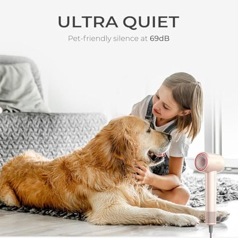 Silencioso y personalizado: ultra silencioso a 69 dB, nuestro secador de pelo garantiza una experiencia de bajo ruido que admite mascotas. Con opciones de 2 velocidades y 4 ajustes de temperatura que corresponden a indicadores codificados por colores, puedes personalizar fácilmente tu aspecto deseado