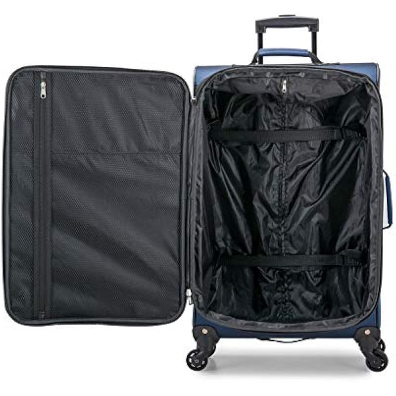 Viaja con estilo con tus elementos esenciales dentro de esta colección de equipaje Aviron Bay de U.S. Traveler. La colección de equipaje Aviron Bay de U. S. Traveler está hecha de poliéster de sarga resistente. Cada maleta cuenta con el detalle de cuatro ruedas giratorias multidireccionales, un mango telescópico para una fácil movilidad, y asas acolchadas en la parte superior y lateral que hacen que sea fácil de levantar. El interior incluye correas de amarre para sujetar las prendas en su lugar y un bolsillo de malla con cremallera debajo de la tapa. La opción de expansión adicional también ayuda con esas compras adicionales hechas mientras viaja! Hecho de tela de poliéster de poliéster duradero. Un mango multi etapa con botón se ajusta a diferentes alturas. Un gran bolsillo interior de malla con cremallera para una fácil organización. Cuenta con cuatro ruedas giratorias de 360 grados para una fácil movilidad. Incluye un refuerzo de expansión de 2 in para un espacio adicional de embalaje. Todas las piezas se enrollan verticalmente, por lo que no hay peso en tu brazo. Incluye un forro interior completo con correas de compresión para mantener los artículos en su lugar. Asas de transporte superior, inferior y lateral para un fácil manejo. El exterior cuenta con dos grandes bolsillos exteriores para artículos de última hora. Dimensiones exteriores: 31” Spinner: 31” de alto x 18” de ancho x 11” de profundidad + 2” Expansión 8. 57 libras. 27” Spinner: 27” de alto x 16” de ancho x 10” de profundidad + 1. 5” Expansión. 7. 45 libras 23” Spinner: 22. 5” de alto x 14” de ancho x 8” de profundidad + 1. 5” Expansión 6. 5 libras. Dimensiones interiores: 31” Spinner: 28” de alto x 18” de ancho x 11” de profundidad + 2” Expansión 27” Spinner: 24” de alto x 16” de ancho x 10” de profundidad + 1. 5” Expansión. 23” Spinner: 20” de alto x 14” de ancho x 8” de profundidad + 1. 5” Expansión