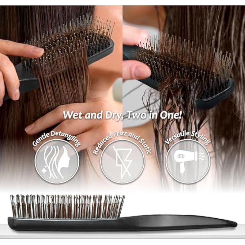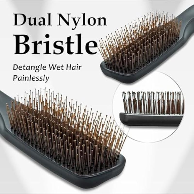 Cerdas de nailon dobles: fabricado con dos cerdas de nailon, el cepillo está diseñado para desenredar el cabello sin esfuerzo. Disfruta del cuidado del cabello sin dolor ya que estas cerdas funcionan perfectamente juntas, proporcionando una experiencia suave y sin estrés en todo momento.