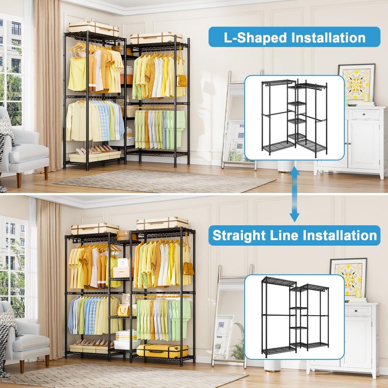 Instalación versátil: este perchero se puede montar en 2 formas para diferentes tipos de habitaciones. La forma de montaje horizontal para el vestidor, y la forma de L para el espacio de la esquina, el apartamento y el guardarropa