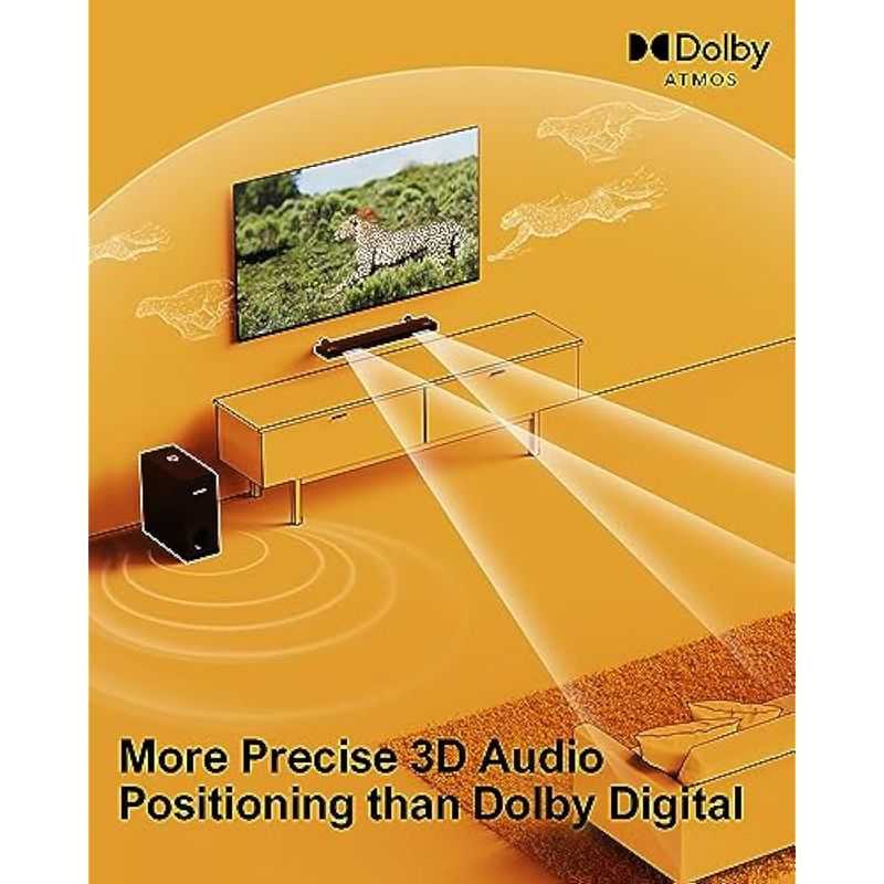 Eleva tu televisor a Dolby Atmos: equipado con Dolby Atmos, una tecnología de audio de vanguardia diseñada para clientes de gama alta, el Nova S50 lleva el sonido a nuevas alturas. Dolby Atmos proporciona una experiencia de sonido multidimensional que proporciona una altura virtual y un elemento envolvente, para llenar dramáticamente la habitación con un sonido increíble.