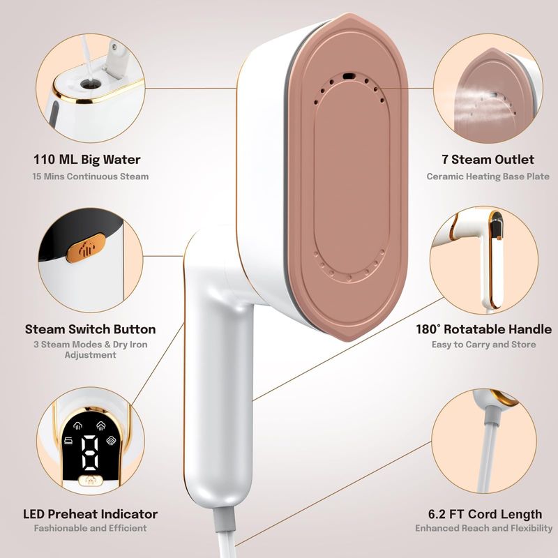 Calentamiento rápido 10S y 1300 W: con una alta potencia de 1300 W, este vaporizador mantiene una temperatura constante de 302 °F, asegurando una eliminación eficiente de arrugas. Con calentamiento rápido de 10 segundos, 3 niveles de vapor y solo 2 minutos para planchar una camisa, supera a las planchas de vapor tradicionales, revitalizando la ropa en un tiempo récord. Además, su capacidad de depósito de agua de 3.7 fl oz permite sesiones de planchado prolongadas sin recargas frecuentes. Perfecto para estudiantes, profesionales, viajeros frecuentes o cualquier persona que busque ropa sin arrugas.