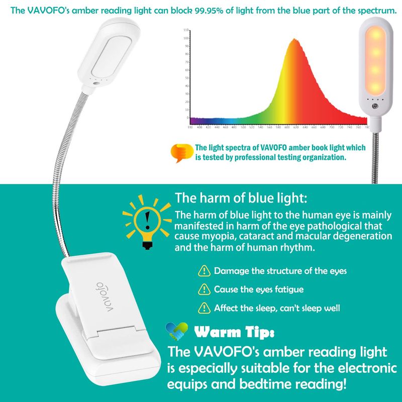 Luz ámbar cuidada de los ojos e indicador de alimentación: el modo de luz ámbar cálida de la luz de libro de lectura de VAVOFO bloquea la luz de espectro azul del 99.95. No daña la luz azul cuando se usa. La luz ámbar cuidada por los ojos es especialmente buena para usar los equipos electrónicos. Puede ser como la luz nocturna saludable. Mientras tanto, la luz de lectura de VAVOFO tiene un diseño humanizado, hay un indicador de encendido en la luz de lectura. Puede conocer el nivel de la batería en cualquier momento. El mejor regalo para personas de cualquier edad.