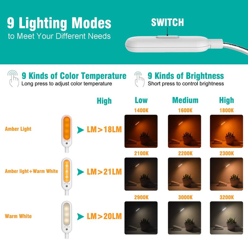 [9 modos de brillo para elegir] 9 temperaturas de color 1400K a 7000K x3 ajustes de brillo bajo, medio, alto. La luz del libro de lectura tiene 9 modos en total para satisfacer todas tus necesidades. Puedes ajustar 9 tipos diferentes de niveles de brillo regulables con un botón que está en la parte superior de la luz de lectura. Puedes elegir tu entorno cómodo favorito de acuerdo a tus demandas, como leer, trabajar, estudiar, coser, acampar o dormir, etc.