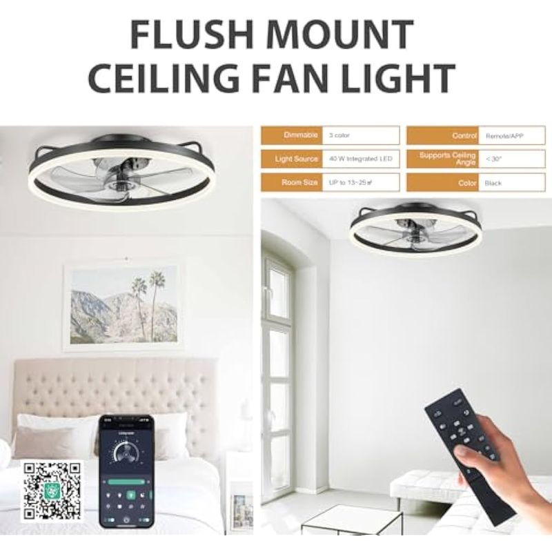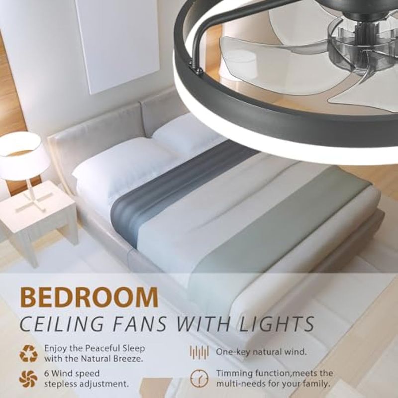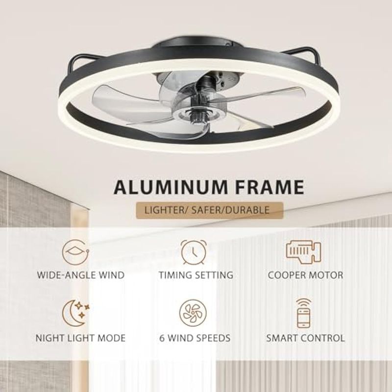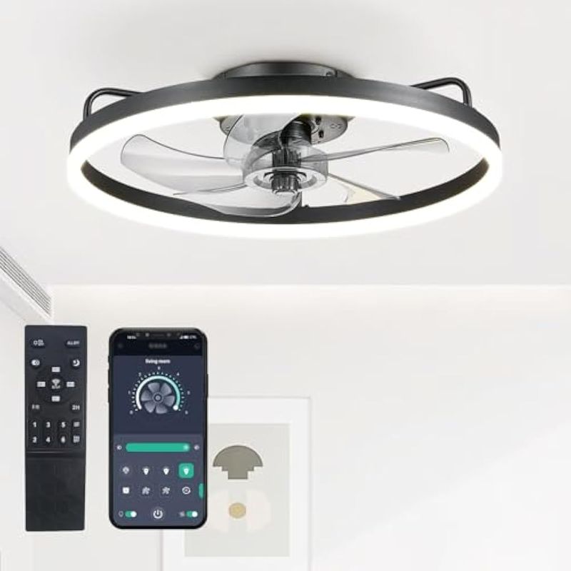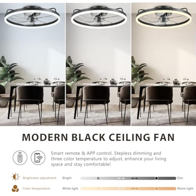 Ventiladores de techo con control remoto y aplicación: ventilador de techo multifunción con velocidad de ventilador de 6 velocidades, tiempo de sueño, color y temperatura de la luz, modo de viento natural, y cambiar la dirección del viento... Todas las funciones son fáciles de cotnrol con el control remoto o la aplicación. Inteligente y conveniente. Personaliza la iluminación acogedora según tus necesidades, crea el ambiente deseado. El ventilador de techo sin aspas mantiene tu habitación elegante y elegante.