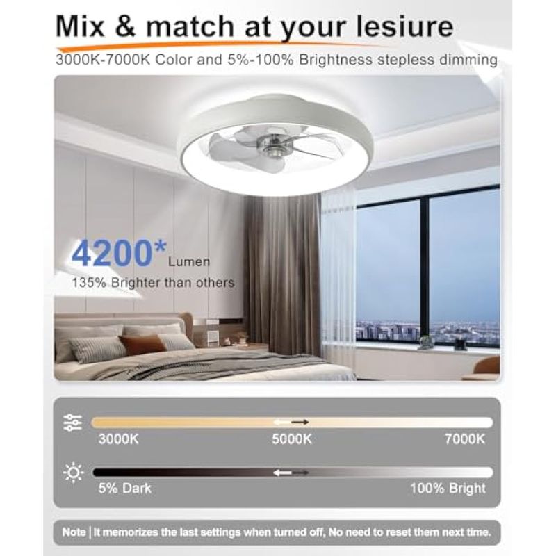 ?Función de atenuación continua y memoria?Este ventilador de techo LED regulable 10 -100 continuo con luces y control remoto te permite personalizar el brillo y la temperatura de color 3000-7000 K, adecuado para cualquier estilo de habitación y escenario de uso, lo que te permite encontrar fácilmente la luz perfecta para tus necesidades. La función de memoria conserva tus últimos ajustes de brillo y color al apagar la luz por control remoto o por aplicación.