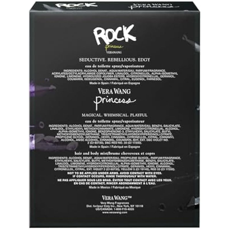 Vera Wang Princesa Ella es una princesa moderna, reescribiendo las reglas reales. Con una mente propia y un poco de ventaja, ella siempre es su propia princesa. Revelando su individualidad y espíritu a cada paso. Radiante y caprichoso, Vera Wang Princess es floral transparente y afrutado rico en vainilla y rebosante de flores exóticas y frutas suculentas. Vera Wang Rock Princess Vera Wang Rock Princess es una fragancia floral oscura y afrutada con una actitud Rockstar. Las suculentas notas de jugoso melocotón en capas con toques de jazmín y rosa que florecen de noche dan un toque femenino al fondo cremoso de vainilla cálida. Es una princesa del rock. Nacido para el rock.