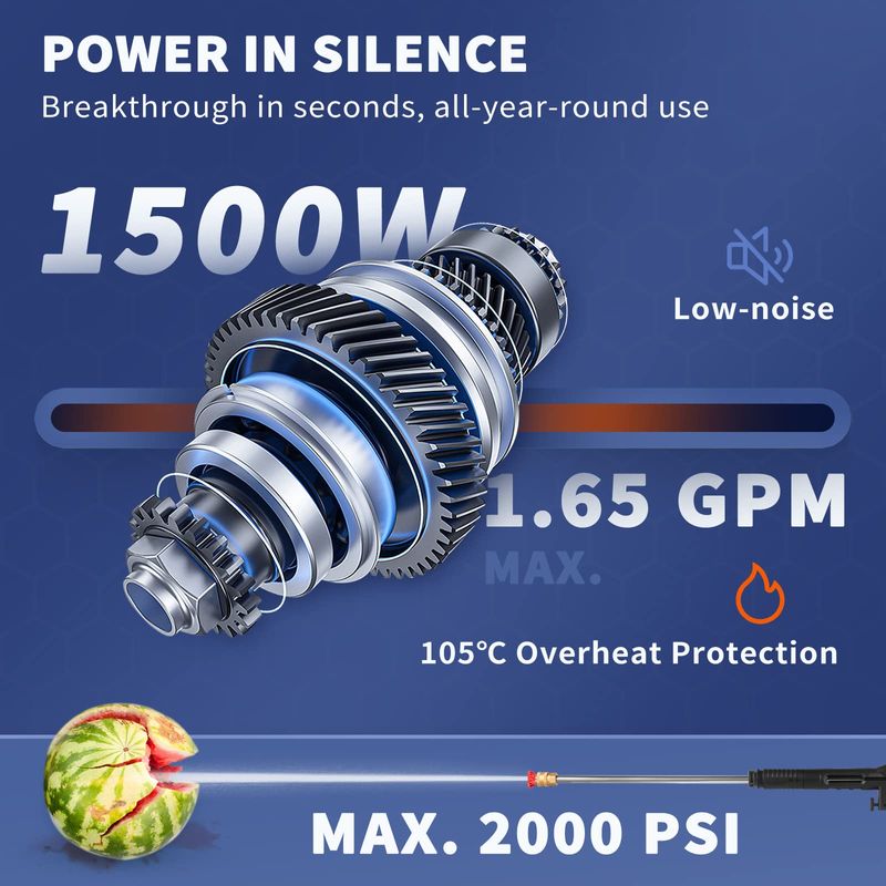 Lavadora de alta presión de 2000 PSI: construida con un potente motor de 1500 W que genera un alto caudal de agua de hasta 1.76 GPM. Por lo tanto, la hidrolimpiadora eléctrica de VEVOR puede limpiar completamente pintura vieja, aceite, malezas y otras manchas difíciles. Ideal para hogares, caravanas, patios, vallas, cubiertas, calzadas, automóviles, equipos de césped, etc. Deja de funcionar automáticamente cuando las temperaturas alcanzan más de 221.0 °F, lo que garantiza la máxima seguridad y un rendimiento constante de alta calidad. Tiene certificación ETL.