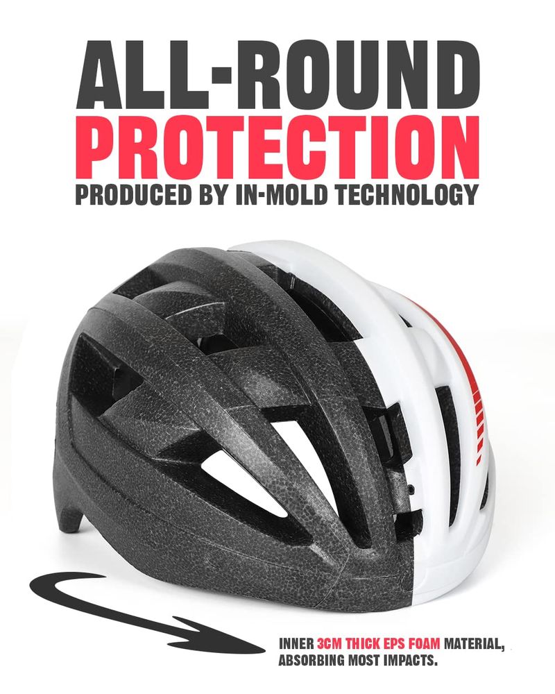 Resistencia al impacto: nuestro casco de bicicleta está hecho de carcasa de policarbonato de alta densidad y espuma EPS, con carcasa dura duradera y almohadilla suave que puede absorber la presión causada por el impacto externo. Nuestro casco de bicicleta proporciona una mejor protección cuando haces ciclismo de carretera o ciclismo de montaña, ayudando en gran medida a disminuir y amortiguar el impacto.