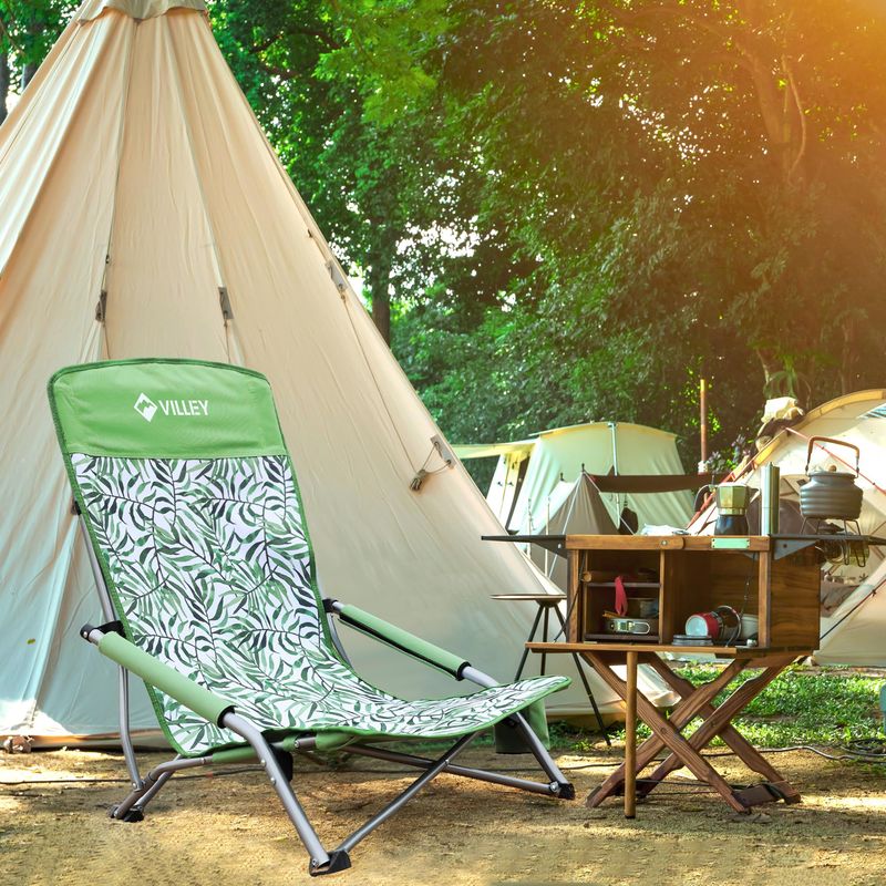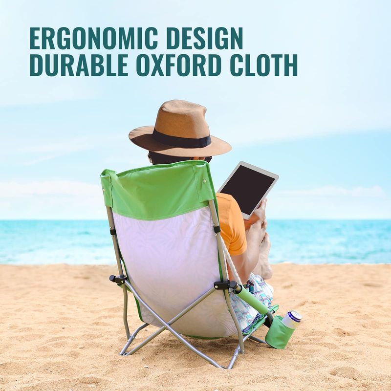 Diseño ergonómico: la silla de playa cuenta con un respaldo alto y un ángulo reclinable razonable que puede aliviar la presión en la espalda y el cuello. El asiento bajo hace que sea fácil enderezar las piernas, lo que permite que tu cuerpo se relaje completamente.