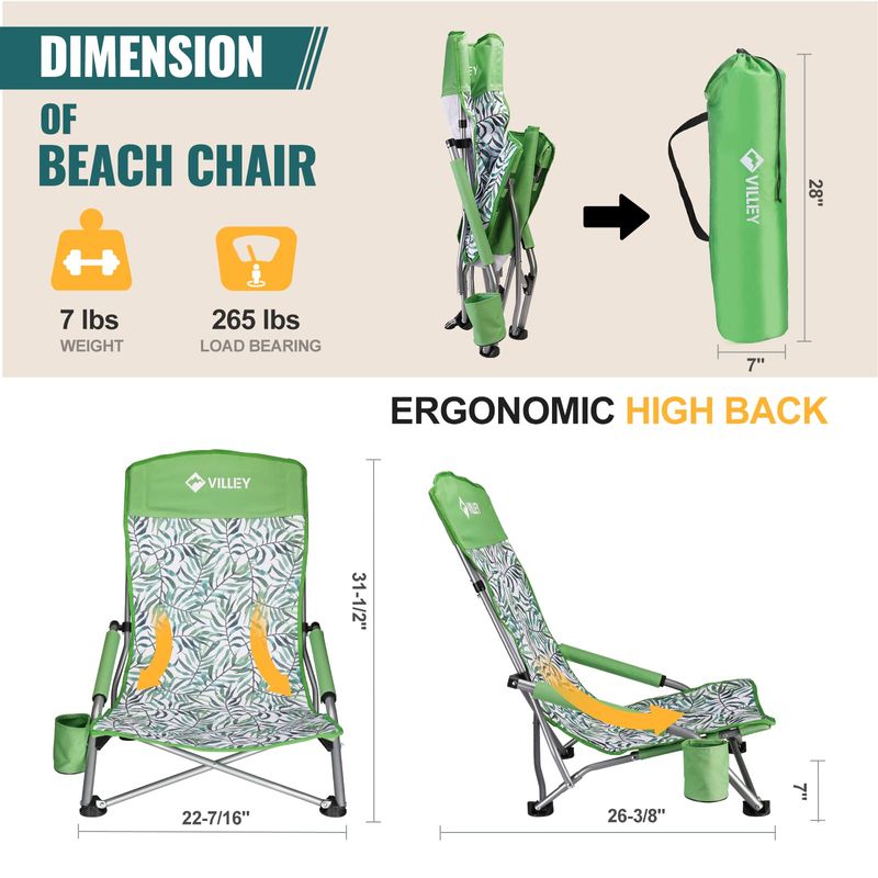VILLEY Sillas de playa bajas para adultos, paquete de 2, sillas de playa plegables con respaldo