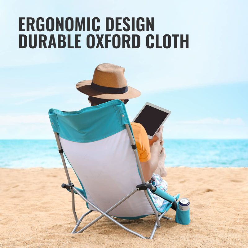 Diseño ergonómico: la silla de playa cuenta con un respaldo alto y un ángulo reclinable razonable que puede aliviar la presión en la espalda y el cuello. El asiento bajo hace que sea fácil enderezar las piernas, lo que permite que tu cuerpo se relaje completamente.