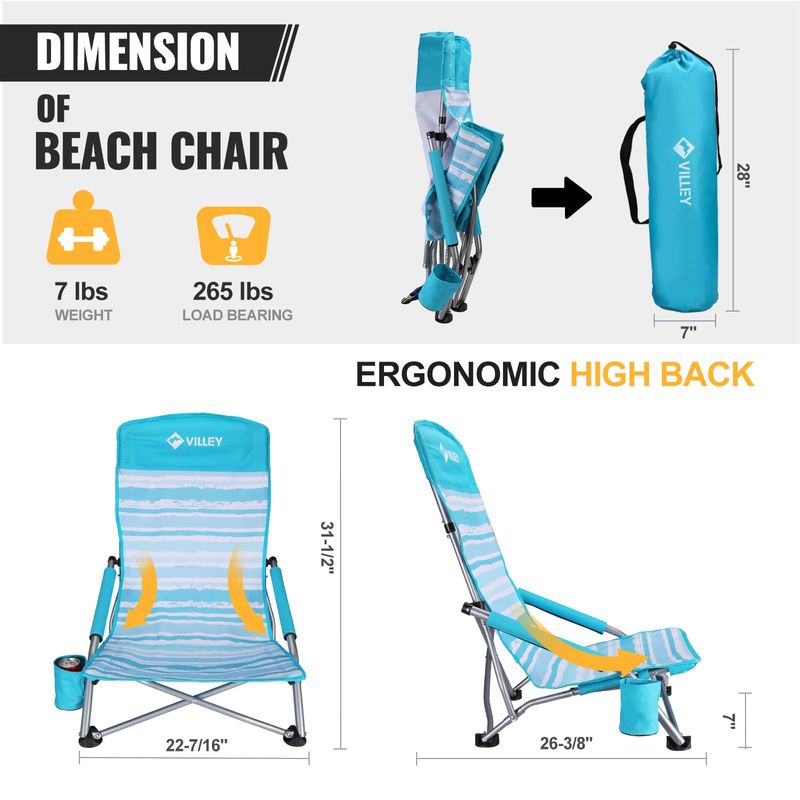 VILLEY SILLAS DE PLAYA BAJAS PARA ADULTOS, PAQUETE DE 2, SILLAS DE PLAYA PLEGABLES CON RESPALDO ALTO, LIGERAS Y PORTáTILES PARA EXTERIORES, PLAYA, CAMPAMENTO, CéSPED, FESTIVAL DE MúSICA, CON PORTAVASOS Y BOLSA DE TRANSPORTE, RAYAS AZULES