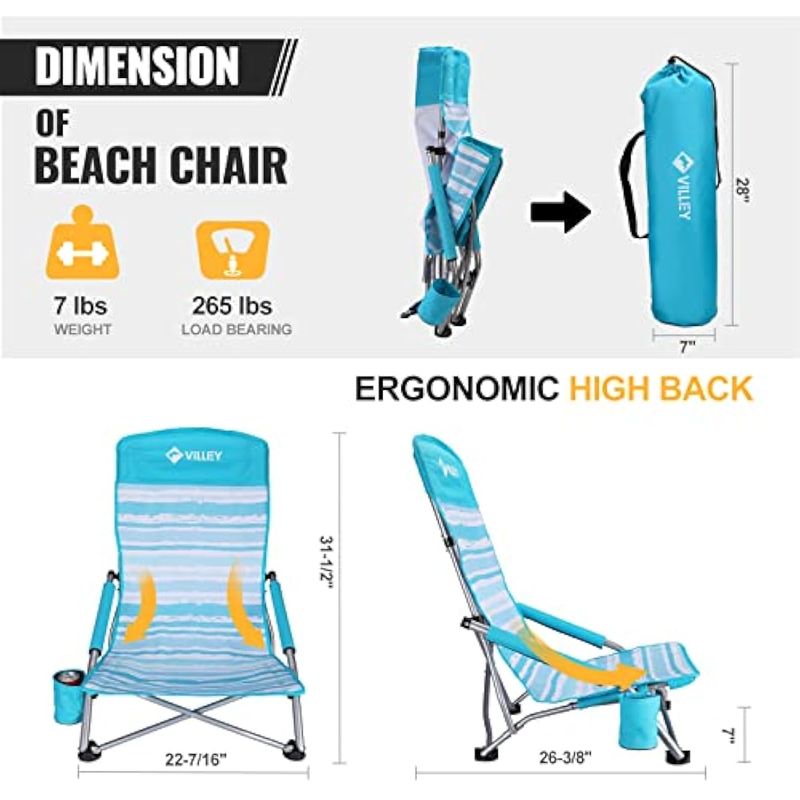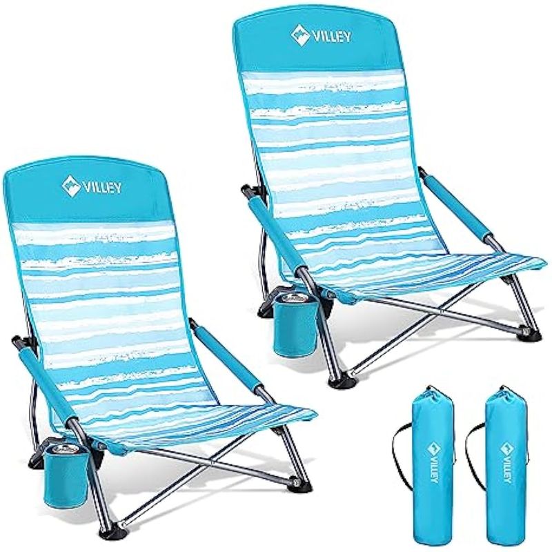 VILLEY SILLAS DE PLAYA BAJAS PARA ADULTOS, PAQUETE DE 2, SILLAS DE PLAYA PLEGABLES CON RESPALDO ALTO, LIGERAS Y PORTáTILES PARA EXTERIORES, PLAYA, CAMPAMENTO, CéSPED, FESTIVAL DE MúSICA, CON PORTAVASOS Y BOLSA DE TRANSPORTE, RAYAS AZULES