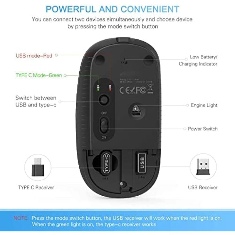 Fácil de usar y práctico: conecta y usa. El receptor nano tipo-C y usb está en el compartimento de la batería del mouse. Sáquelo y conéctelo al puerto del dispositivo por separado. No se necesitan controladores ni software adicionales. Puede cambiar entre dispositivos conectados con un solo botón. Guarda el receptor en el compartimento de la batería cuando estés en movimiento