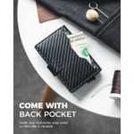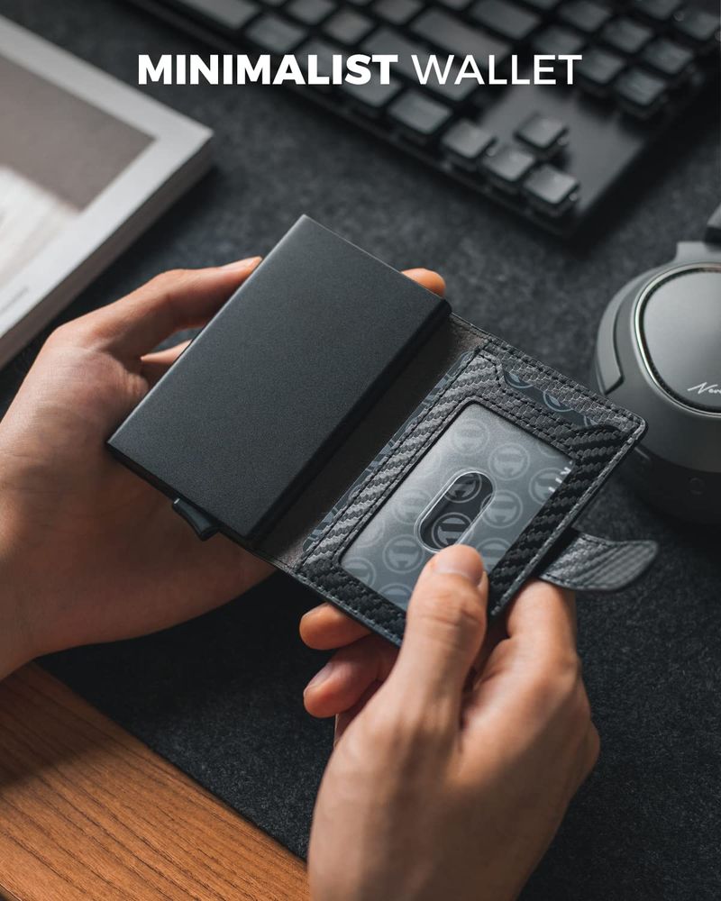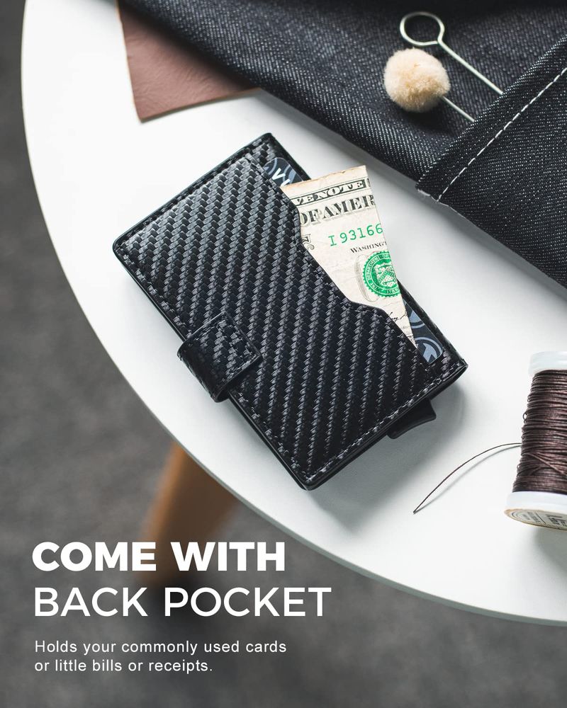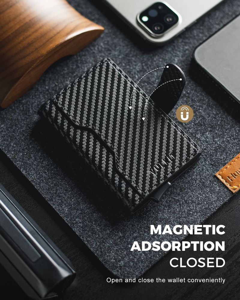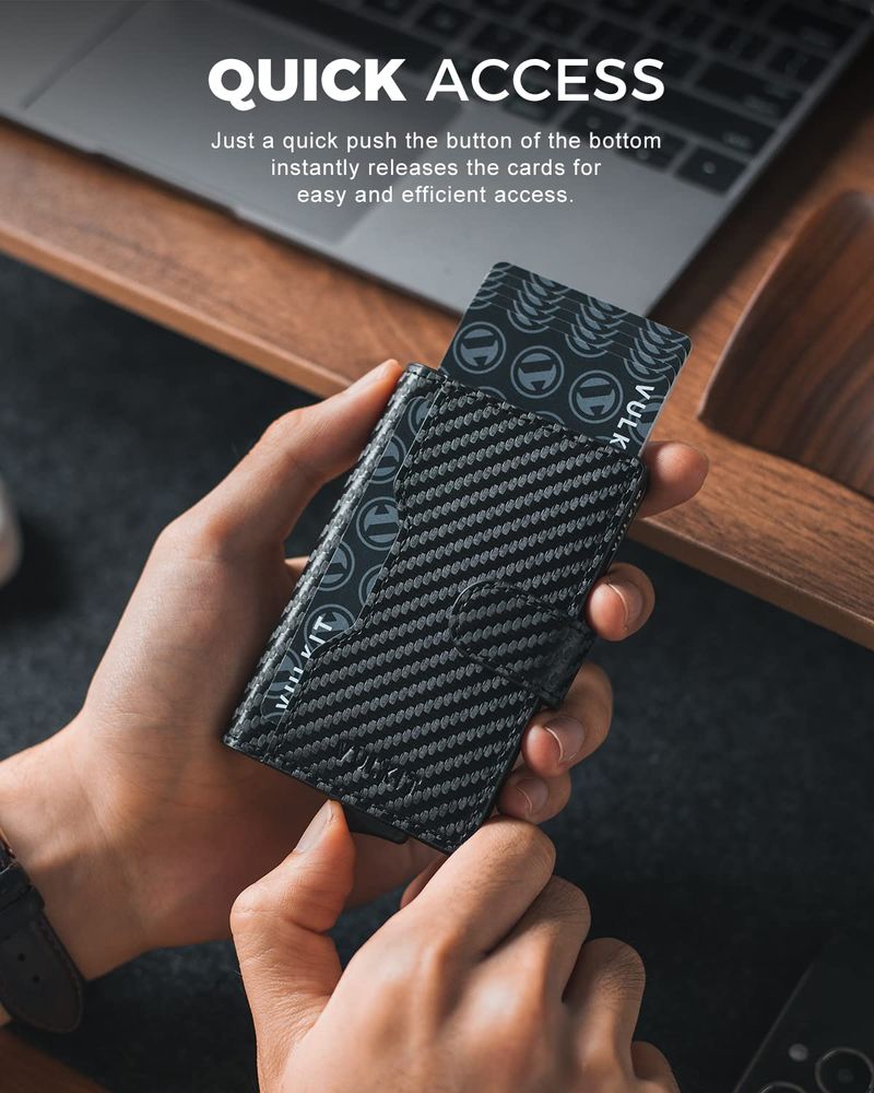 VULKIT Cartera desplegable con ranuras de cuero, bloqueo RFID, funda de metal delgada para tarjetas