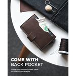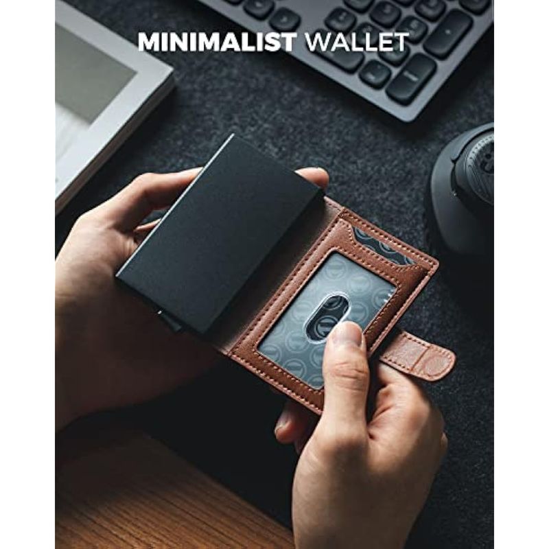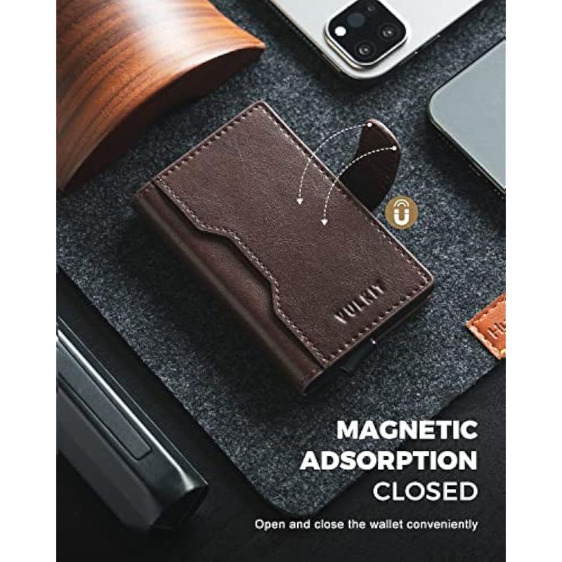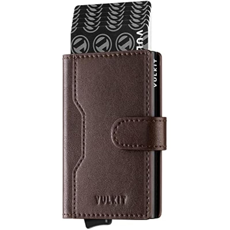 VULKIT Cartera desplegable con ranuras de cuero, bloqueo RFID, funda de metal delgada para tarjetas