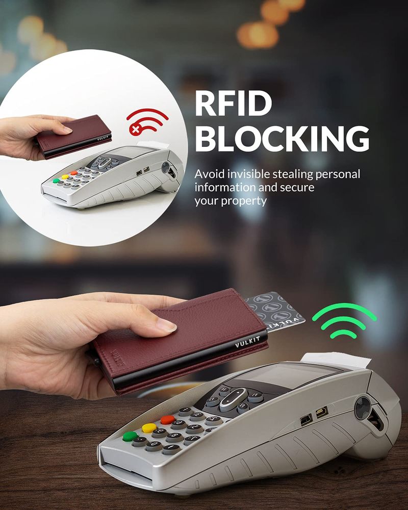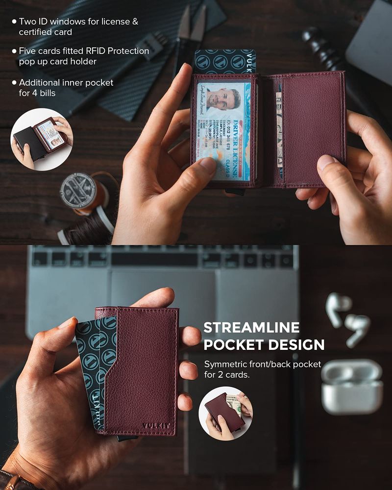 VULKIT Tarjetero con ventana de identificación, tarjetas emergentes, delgada, de cuero, con