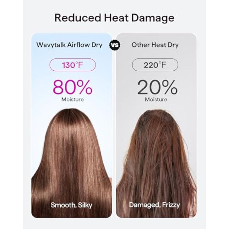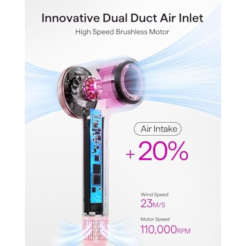 Secado 5 veces más rápido: el secador de pelo de alta velocidad wavytalk está equipado con un potente motor sin escobillas de 110,000 RPM que ofrece velocidades de aire de hasta 75.5 fts. Su configuración única de conducto de aire de doble entrada permite un aumento del 20 en la salida del flujo de aire, proporcionando una experiencia de secado rápido en 3-5 minutos con flujos de aire de alta velocidad. Esto permite a los usuarios secar el cabello hasta cinco veces más rápido que con un secador de pelo tradicional