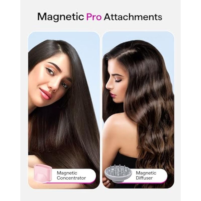Accesorios magnéticos Pro: Los accesorios magnéticos están fijados de forma segura por succión y se pueden girar libremente en orientación de 360°, intercambios fáciles para un estilo versátil. La boquilla de aire del secador de pelo está diseñada para concentrar el flujo de aire, por lo que es una opción óptima para un peinado preciso. El difusor está diseñado para dispersar el flujo de aire uniformemente y mitigar el encrespamiento para cabello rizado u ondulado