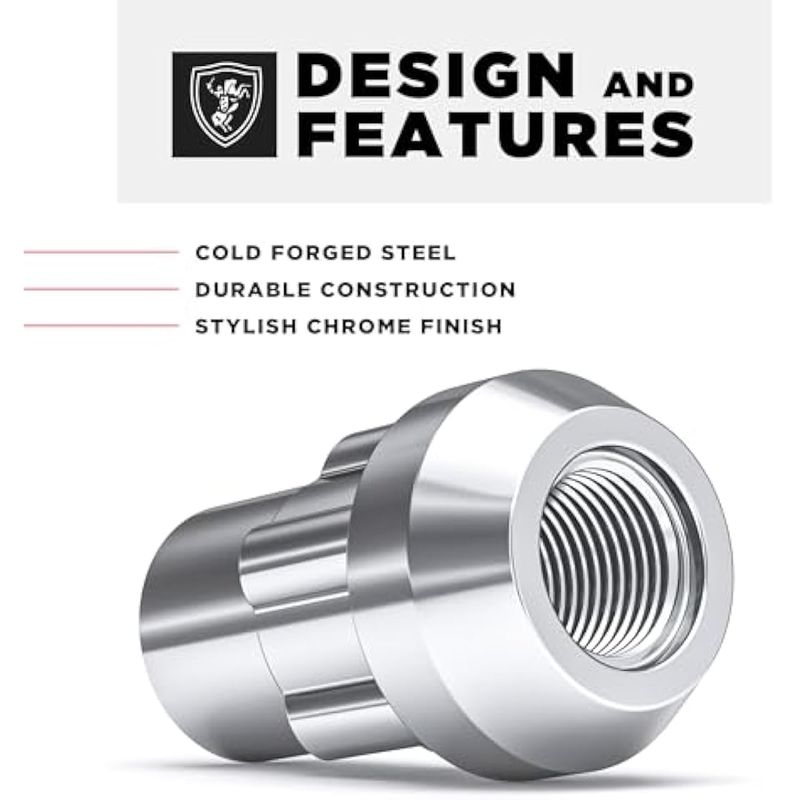 Construcción duradera de acero al carbono forjado en frío y probada según los estándares de la industria. Elegante acabado cromado o negro cromado. El diseño antirrobo evita el robo en las ruedas.