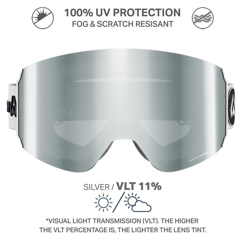 Tecnología de lente Aurora. Nuestro diseño de lente doble esférica panorámica con revestimiento antivaho y antirrayas te permite ver el terreno en cualquier condición de luz sin distorsión al mismo tiempo que protege tus ojos de los reflejos y los dañinos rayos UV.