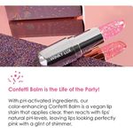SHIMMER: El bálsamo labial de confeti es una fiesta para tu puchero. Con ingredientes activados por el pH, nuestro bálsamo labial de confeti que mejora el color es un tinte labial vegano que se aplica claro, luego reacciona con los niveles de pH naturales de los labios para crear un rosa perfectamente personalizado con un brillo de brillo. Deslízalo para ver los labios que salen desde el brunch hasta la fiesta posterior.