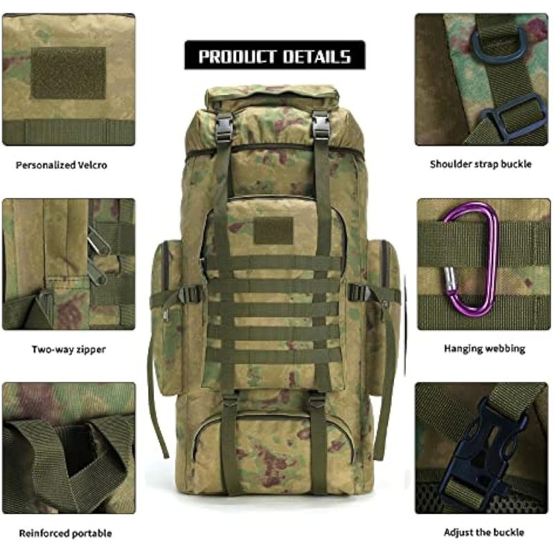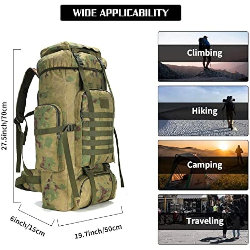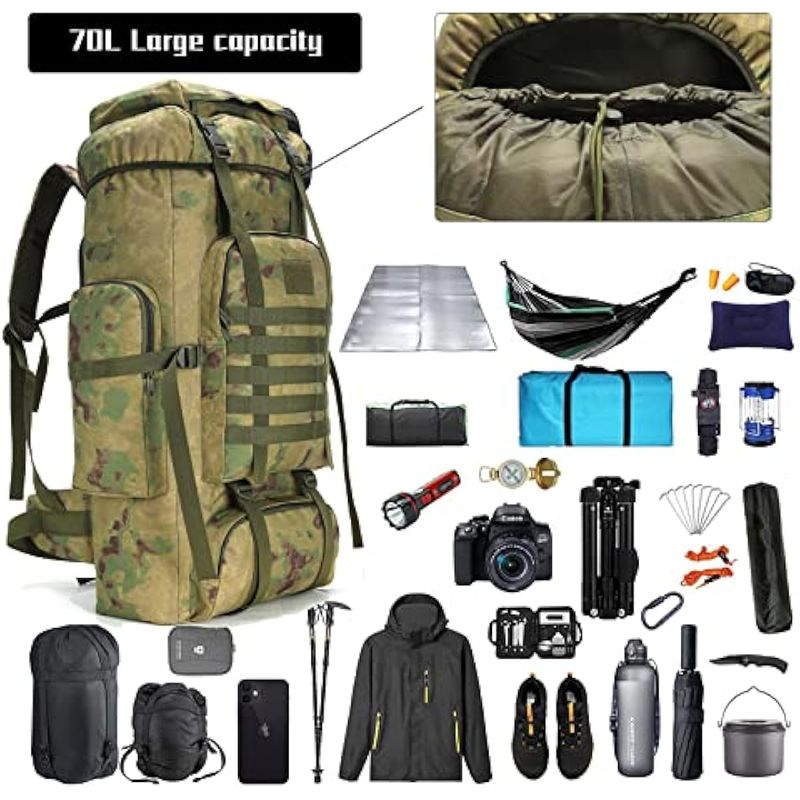 Estructura de mochila de senderismo: La mochila de campamento de gran capacidad de 70 l, bolsa de almacenamiento principal con cordones elásticos que pueden expandir el paquete, es lo suficientemente espaciosa para que puedas colocar el saco de dormir, la colchoneta, la hamaca o zapatos y equipaje, un compartimento para portátil, un bolsillo frontal con cremallera y dos bolsillos laterales para botellas de agua o paraguas.