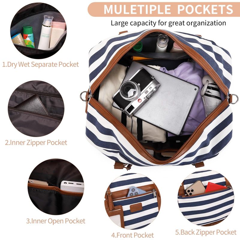 ?Inner Large Sealed Waterproof Pocket Function& Multi Pockets Safety Design?The weekender bag provides versatility and comfort. with a total of 6 pockets and 1 shoe compartment, never worry about losing your important items ever again.One inner large sealed waterproof pocket, helps to keep the wet clothes, towels store separately with dry stuffs,protect your toiletries clean and tidy.
