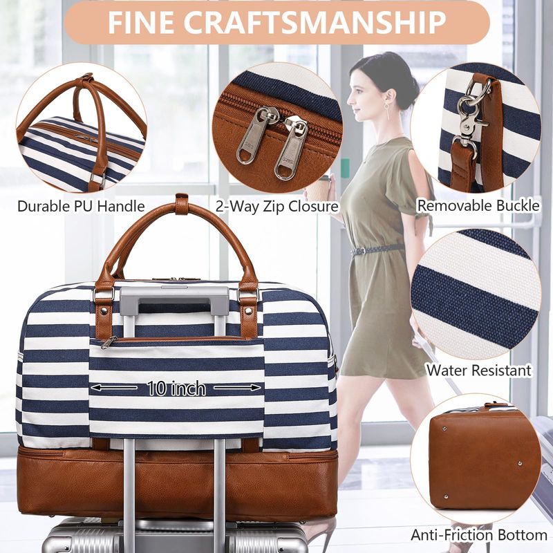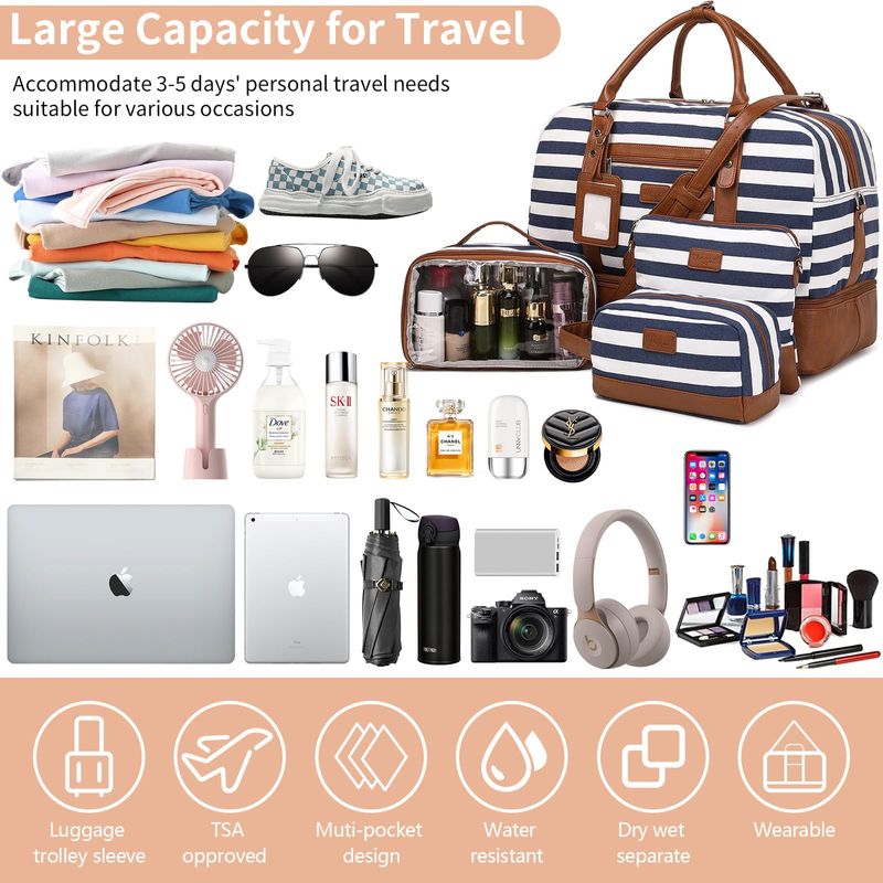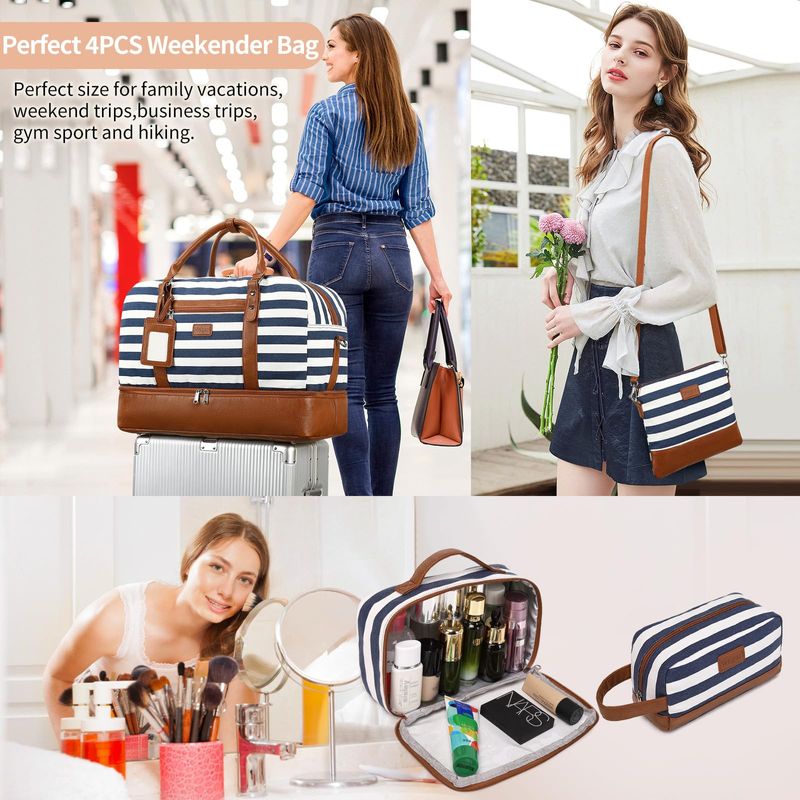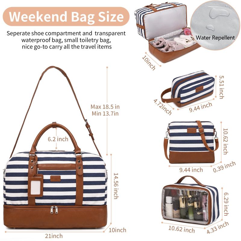 ?Perfect 4PCS Weekender Bag?The travel weekender bag comes with $18 toiletry bag, 2 adjustable & detachable shoulder straps,card pocket and shoe compartment. This weekend bag is crafted with waterproof premium soft canvas and PU leather material, Durable and not easy to wear. Perfect for men and women to use in daily travel or business trip,meet the flight regulations and requirements for carry on luggage.