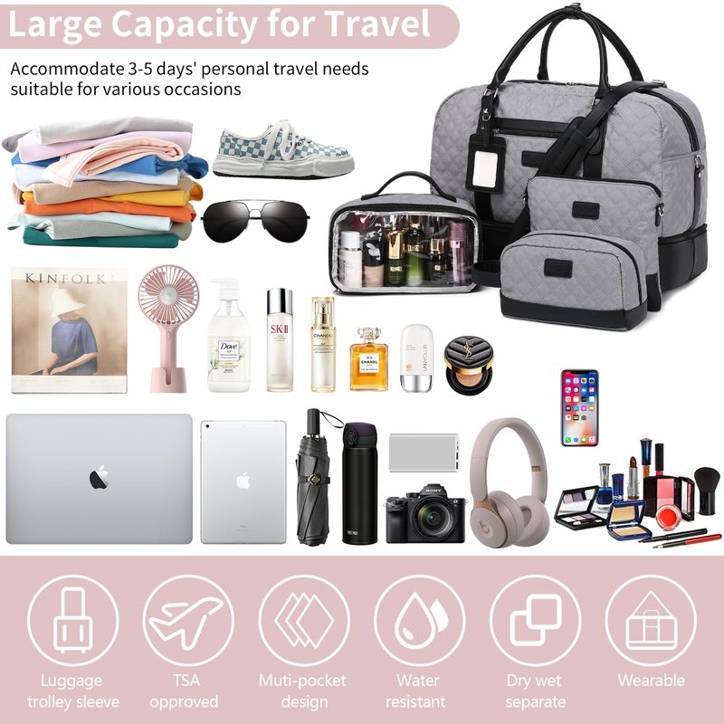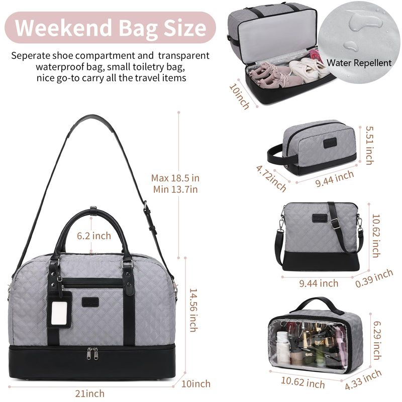 ?Perfect 4PCS Weekender Bag?The travel weekender bag comes with $18 toiletry bag, 2 adjustable & detachable shoulder straps,card pocket and shoe compartment. This weekend bag is crafted with waterproof premium soft canvas and PU leather material, Durable and not easy to wear. Perfect for men and women to use in daily travel or business trip,meet the flight regulations and requirements for carry on luggage.