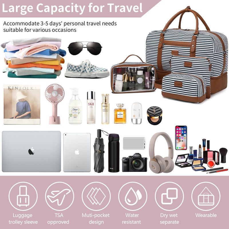 ?Inner Large Sealed Waterproof Pocket Function& Multi Pockets Safety Design?The weekender bag provides versatility and comfort. with a total of 6 pockets and 1 shoe compartment, never worry about losing your important items ever again.One inner large sealed waterproof pocket, helps to keep the wet clothes, towels store separately with dry stuffs,protect your toiletries clean and tidy.