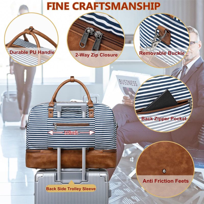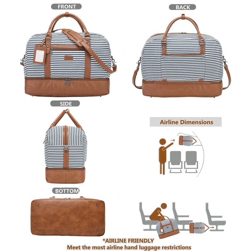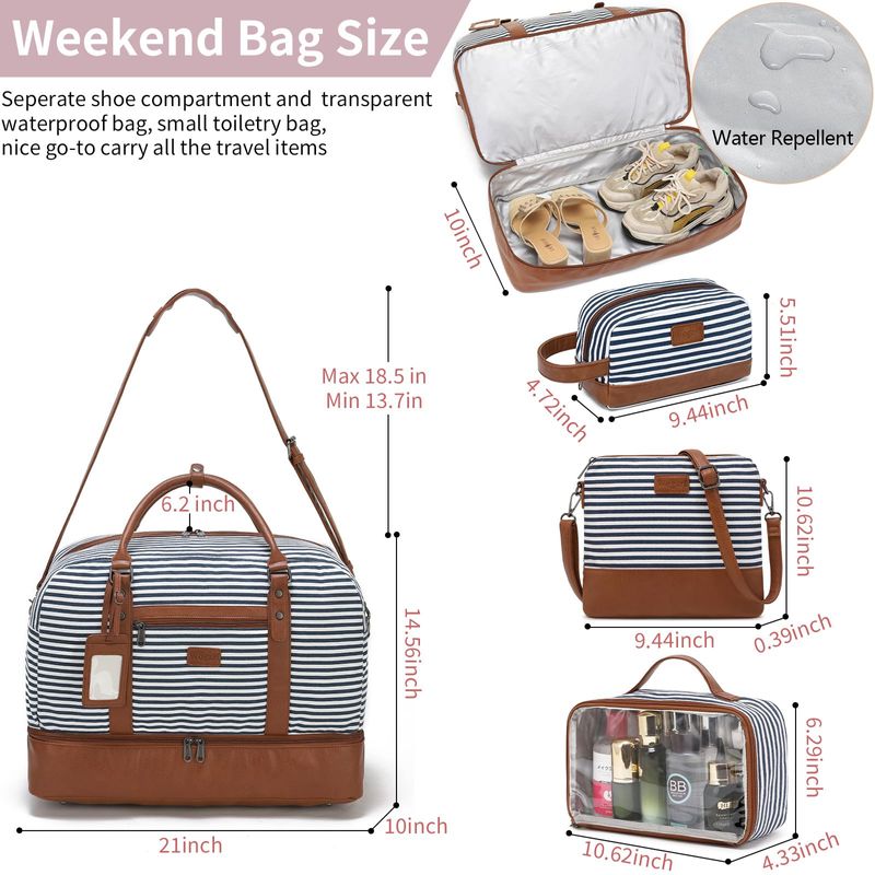 ?Perfect 4PCS Weekender Bag?The travel weekender bag comes with $18 toiletry bag, 2 adjustable & detachable shoulder straps,card pocket and shoe compartment. This weekend bag is crafted with waterproof premium soft canvas and PU leather material, Durable and not easy to wear. Perfect for men and women to use in daily travel or business trip,meet the flight regulations and requirements for carry on luggage.