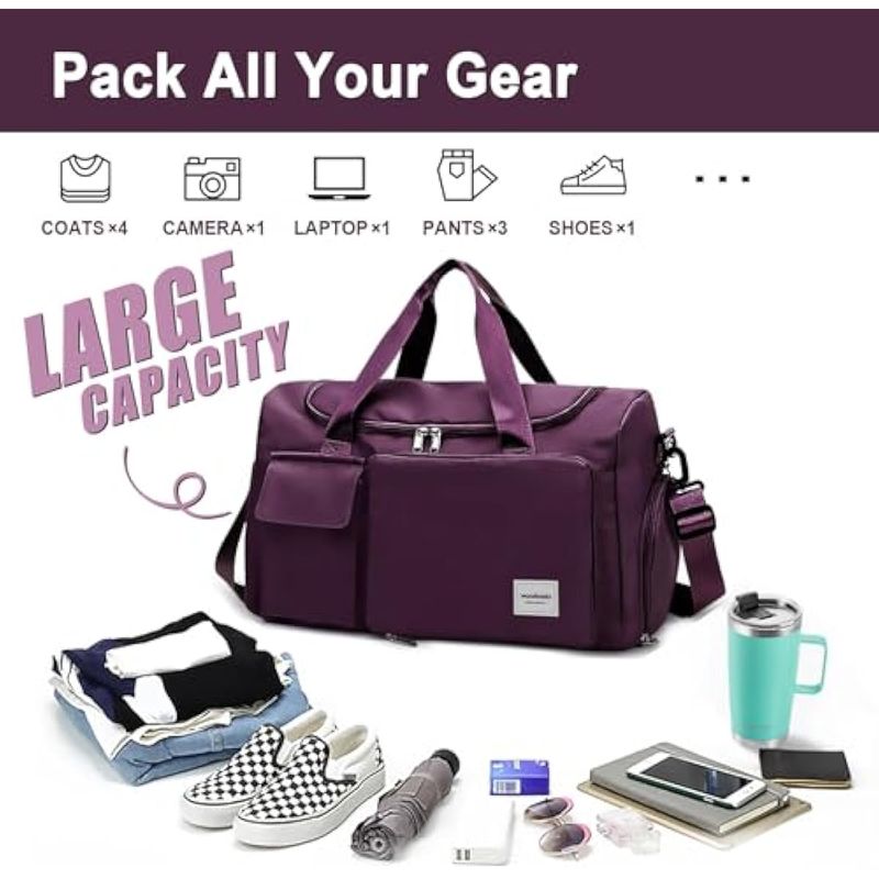 WOOMADA BOLSA DE VIAJE PLEGABLE CON COMPARTIMENTO PARA ZAPATOS, BOLSA DE NOCHE CON BOLSILLO HúMEDO Y FUNDA DE CARRETILLA, BOLSAS DE FIN DE SEMANA PARA MUJER, A-PúRPURA GRISáCEO, BOLSA DE VIAJE