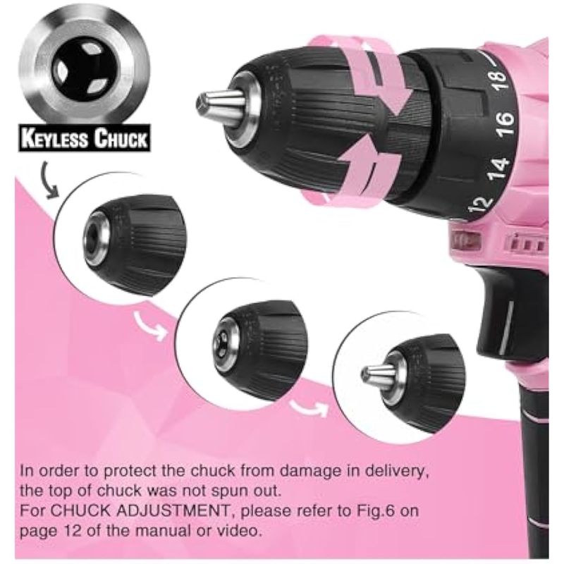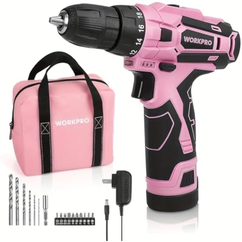 WORKPRO JUEGO DE DESTORNILLADORES INALáMBRICOS ROSADOS, KIT DE HERRAMIENTAS DE DESTORNILLADOR ELéCTRICO DE 12 V, PORTABROCAS SIN LLAVE DE 3/8 PULGADAS, CARGADOR Y BOLSA DE ALMACENAMIENTO INCLUIDOS, CINTA ROSA