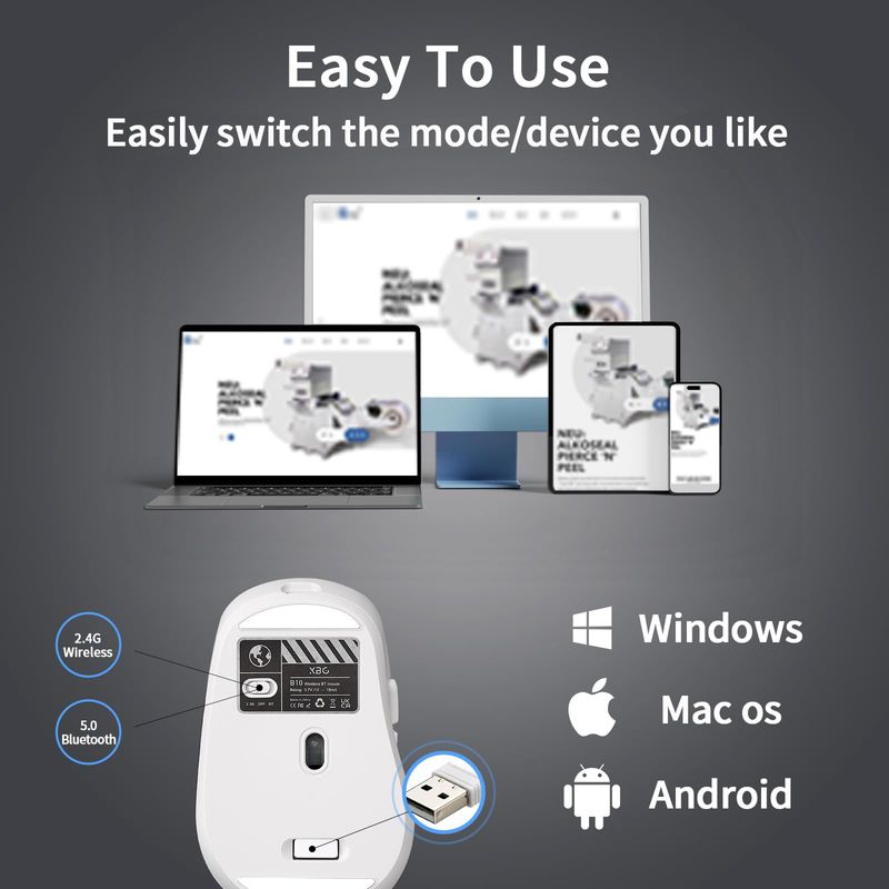 Dual-Mode Bluetooth Mouse for LaptopBT 5.0+2.4GHz: with a dual-mode connection, you can switch freely between two devices with one Bluetooth mouse with a simple switch. Easy to use from desktop to laptop, or tablet to Macbookphone.