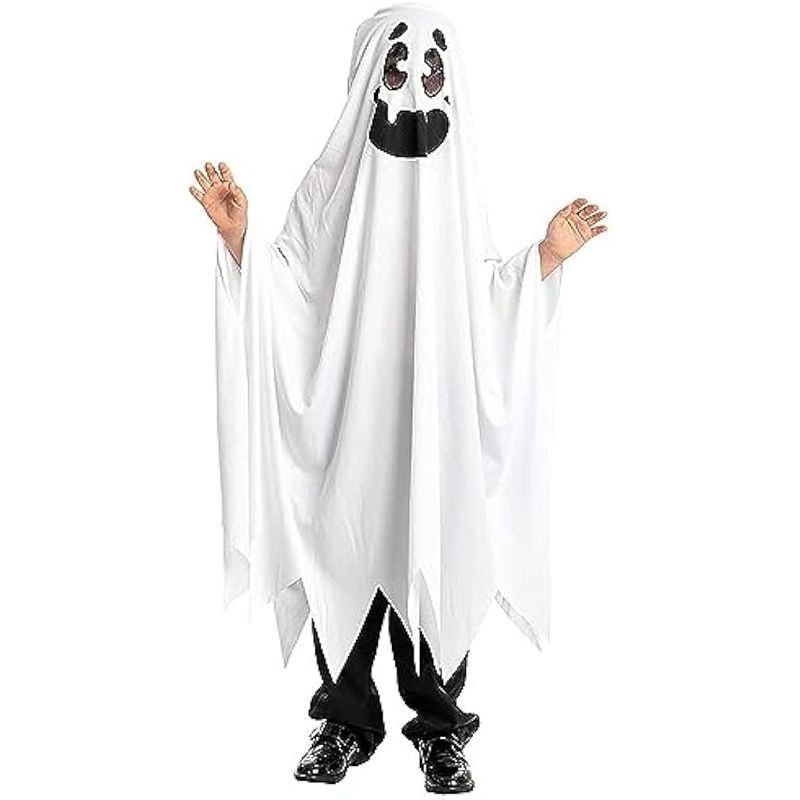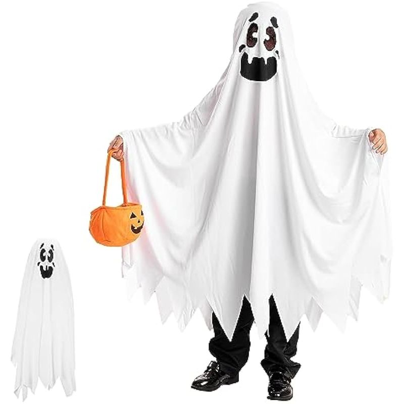 Disfraz de fantasma Boo y amigable para Halloween infantil: bonito y amigable disfraz de alma perdida incluye bata de fantasma sonriente 1 capa y canasta de calabaza espeluznante, disfraz de fantasma unisex para niños.