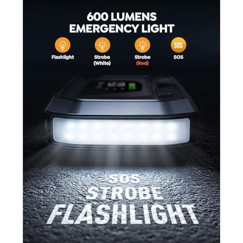 Diseño avanzado: 600 lúmenes de luces LED grandes brillantes, 6-7 veces más brillantes que otros arrancadores portátiles de automóvil, se iluminan hasta 96 horas constantemente. 4 modos de luces linternaSOS-blancoSOS-rojoestroboscópico para diferentes emergencias, como triángulo de advertencia. Diseño humanizado con un asa resistente, fácil de llevar.