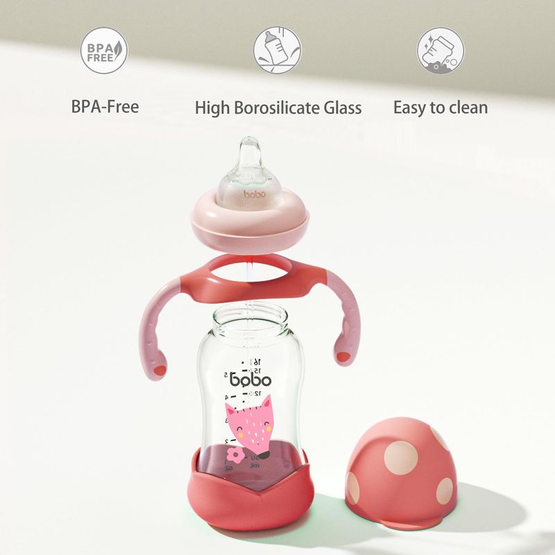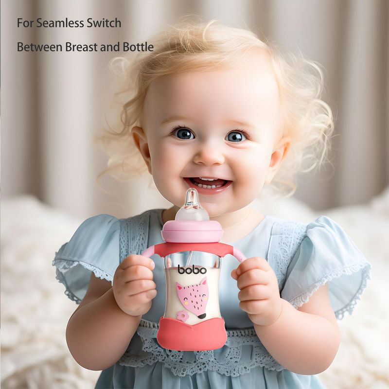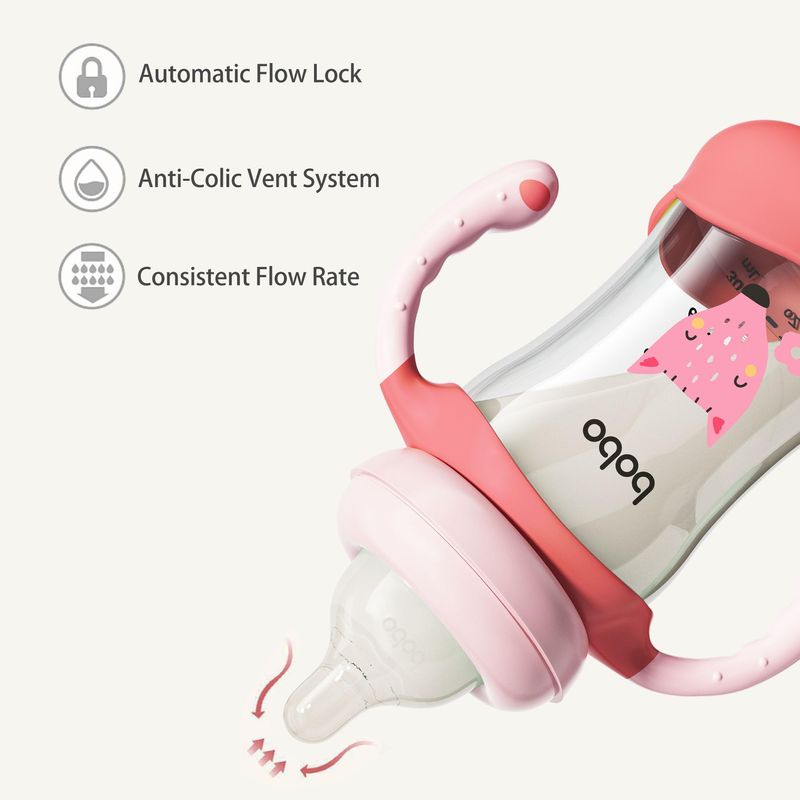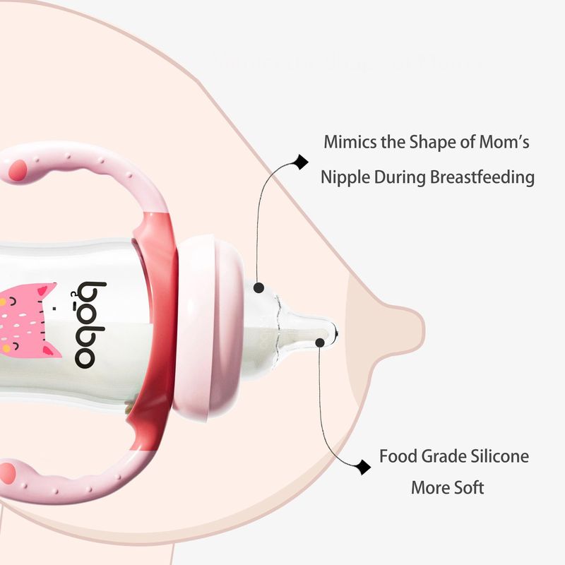 Nuestros biberones también vienen con un diseño único de bola de gravedad que permite que tu bebé beba a voluntad. La parte inferior está equipada con una cubierta de goma gruesa para hacer que la botella sea más estable. El mango extraíble hace que sea más fácil de sostener para tu bebé.