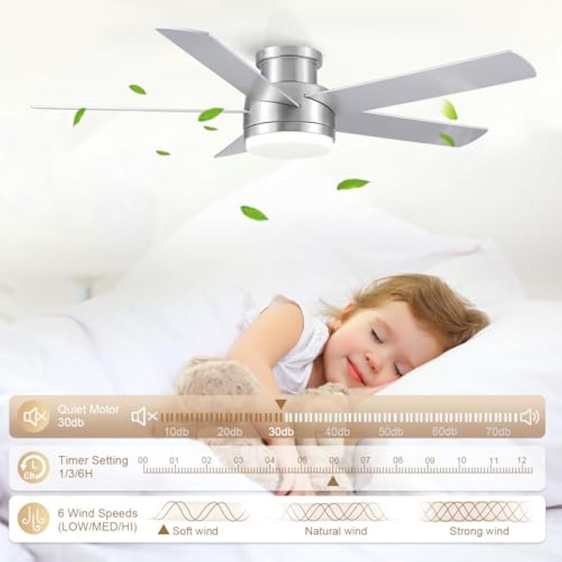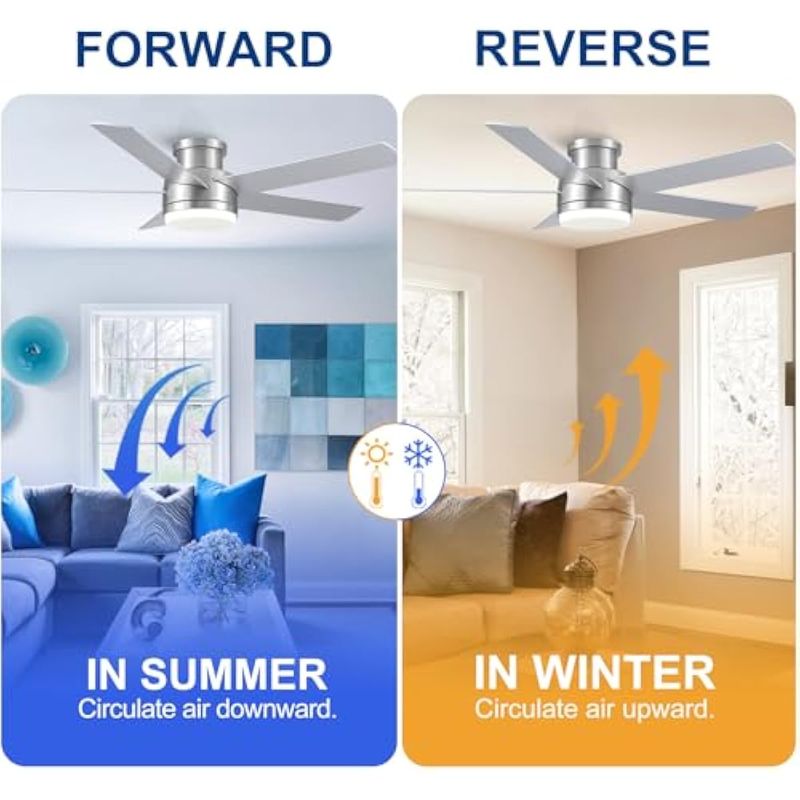 Ventilador de techo reversible silencioso: en verano, el modo de avance permite que el aire fluya hacia abajo, mientras que el ventilador de techo tiene un buen flujo de aire de más de 4500 CFM para mantenerte fresco y menos de 30 decibelios de sonido para un ambiente cómodo para dormir. En invierno, el modo inverso permite que el aire fluya hacia arriba para que el aire caliente producido por el equipo de calefacción de la habitación se distribuya uniformemente por toda la habitación. Puedes utilizar el ventilador de techo durante todo el año.