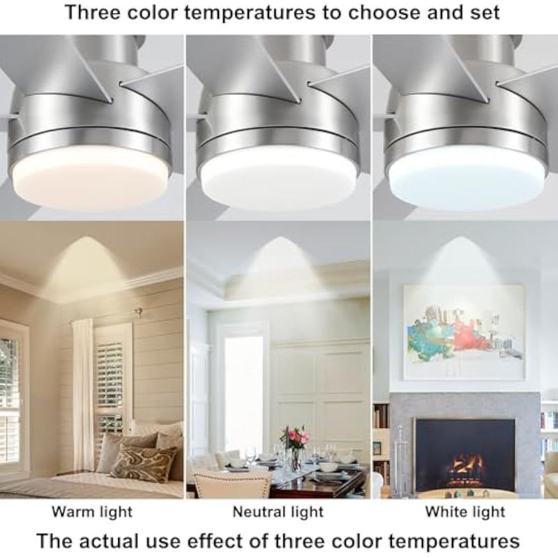 Ventilador de techo LED regulable: el ventilador de techo utiliza una fuente de luz LED reemplazable. En comparación con las fuentes de luz ordinarias, las fuentes de luz LED son más eficientes energéticamente y tienen una vida útil más larga. Hay 3 temperaturas de color para elegir luz cálida de 3000 K, luz natural de 4000 K, luz blanca fría de 6500 K. Brillo ajustable 0 ~ 100. Cuando estás de fiesta, trabajando o durmiendo, puedes utilizar diferentes temperaturas de color y brillo.