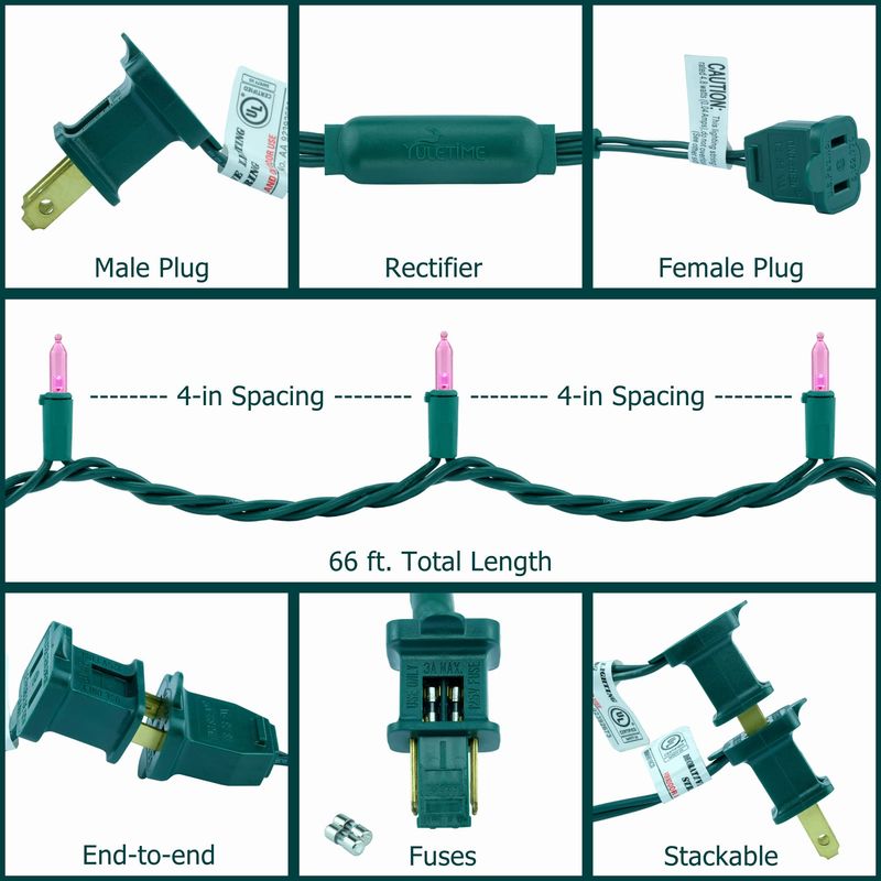 Especificaciones: 200 bombillas LED de color blanco cálido en cable verde, 1 hebra de longitud total de 66 pies. Espacio de 4 pulgadas, cable de 6 pulgadas, cola de 6 pulgadas. Cable de grado comercial 22 AWG con núcleo de cobre puro, resistente y resistente. El diseño impermeable permite su uso en interiores y exteriores. Las cadenas pueden proporcionar un uso prolongado de conexiones de extremo a extremo. Toda la potencia de la tira de luces es de 7 vatios y la potencia de conexión máxima nominal es de 216 vatios con hasta 30 hebras funcionando simultáneamente.
