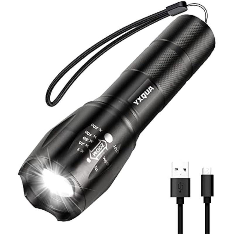 YXQUA LINTERNAS RECARGABLES POR USB, 8381 LUCES DE LúMENES ALTOS, 3 MODOS, ZOOM E IMPERMEABLE, LUZ DE FLASH SúPER BRILLANTE PARA CAMPING, SENDERISMO, HURACáN DE EMERGENCIA (5.1 PULGADAS)