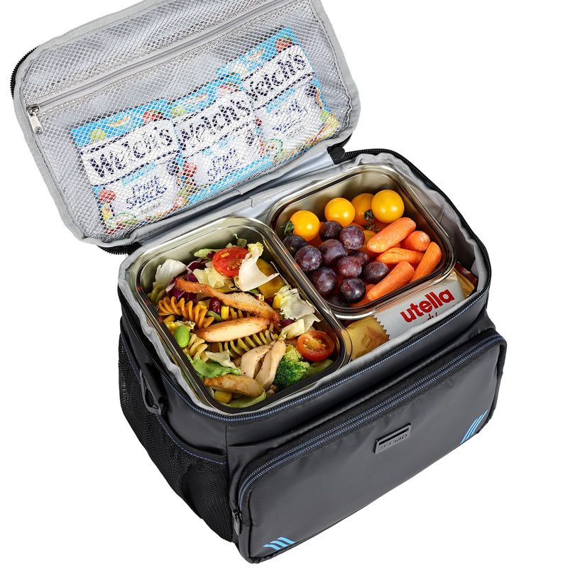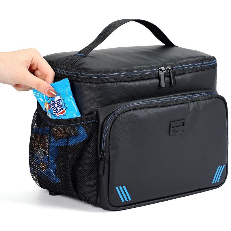 GRAN CAPACIDAD: 12 x 9.5 x 10 pulgadas, compartimentos duales, amplio compartimento principal para 24 latas. Compartimento superior para loncheras, aperitivos y cubiertos.
