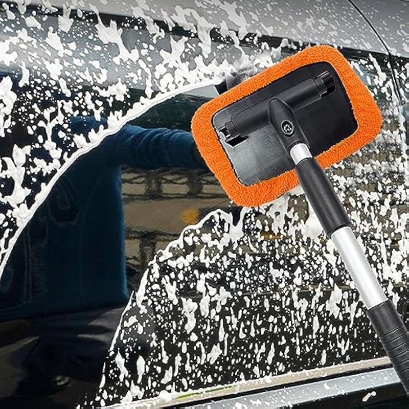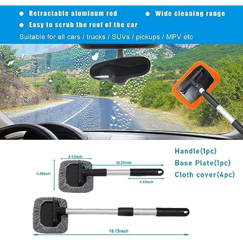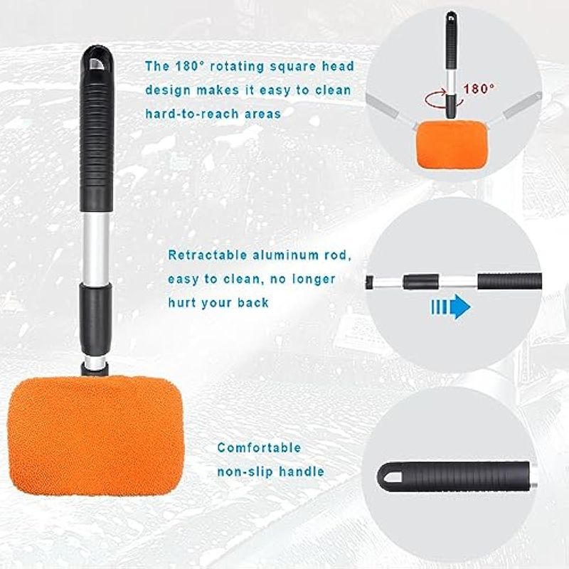 ZICINER LIMPIADOR DE PARABRISAS DE AUTOMóVIL, LIMPIAPARABRISAS DE MICROFIBRA CON MANGO EXTENSIBLE DE ALUMINIO Y 2 CABEZALES DE ALMOHADILLA DE TELA LAVABLES Y REUTILIZABLES, KIT DE LIMPIEZA INTERIOR DEL VEHíCULO (NARANJA-RECTANGULAR)