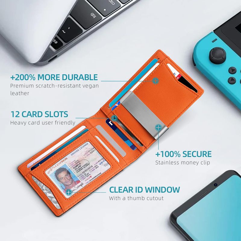 ZITAHLI - CARTERAS DELGADAS CON CLIP PARA DINERO PARA HOMBRE, TARJETERO MINIMALISTA, DE CUERO, PLEGABLE, CON BLOQUEO RFID, CARTERA DE BOLSILLO CON 12 RANURAS PARA TARJETAS, CON CAJA DE REGALO, NEGRO CARBóN Y NARANJA